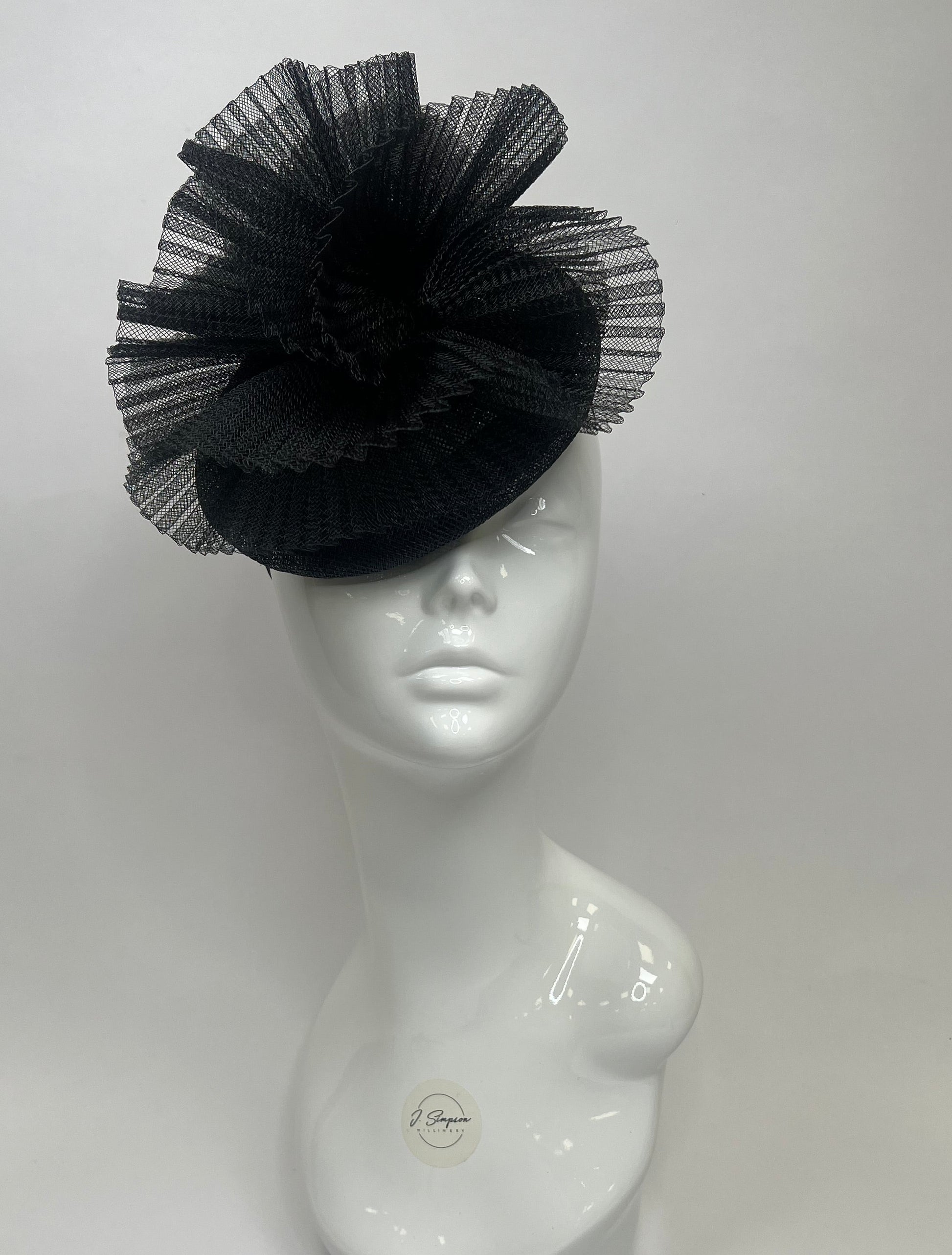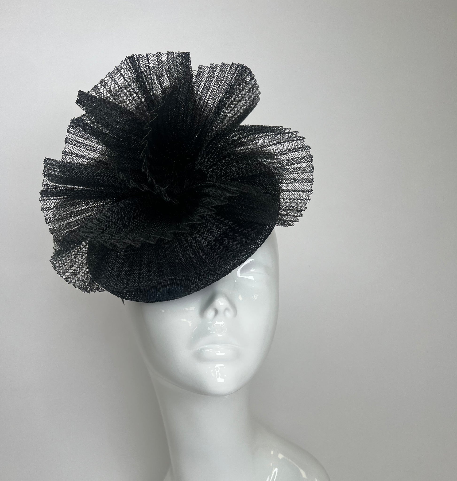 Betty is a beautifully structured, modern take on classic couture millinery. Crafted on a wired button base, the design features layers of finely pleated crinoline, hand-shaped into soft, voluminous folds that create a striking silhouette from every angle.