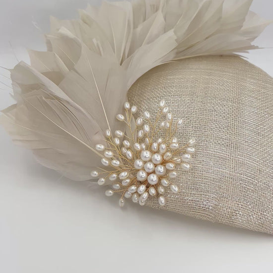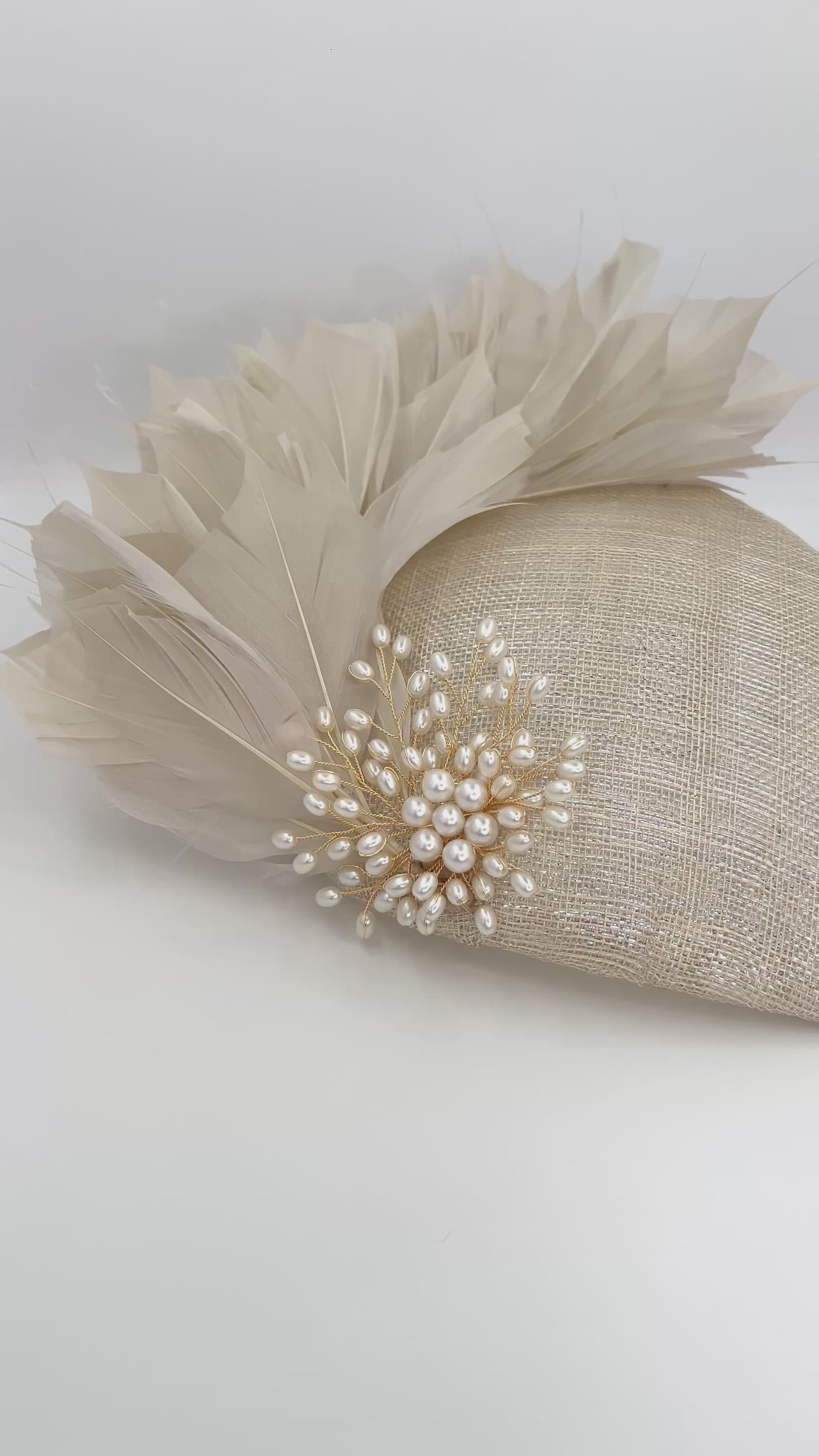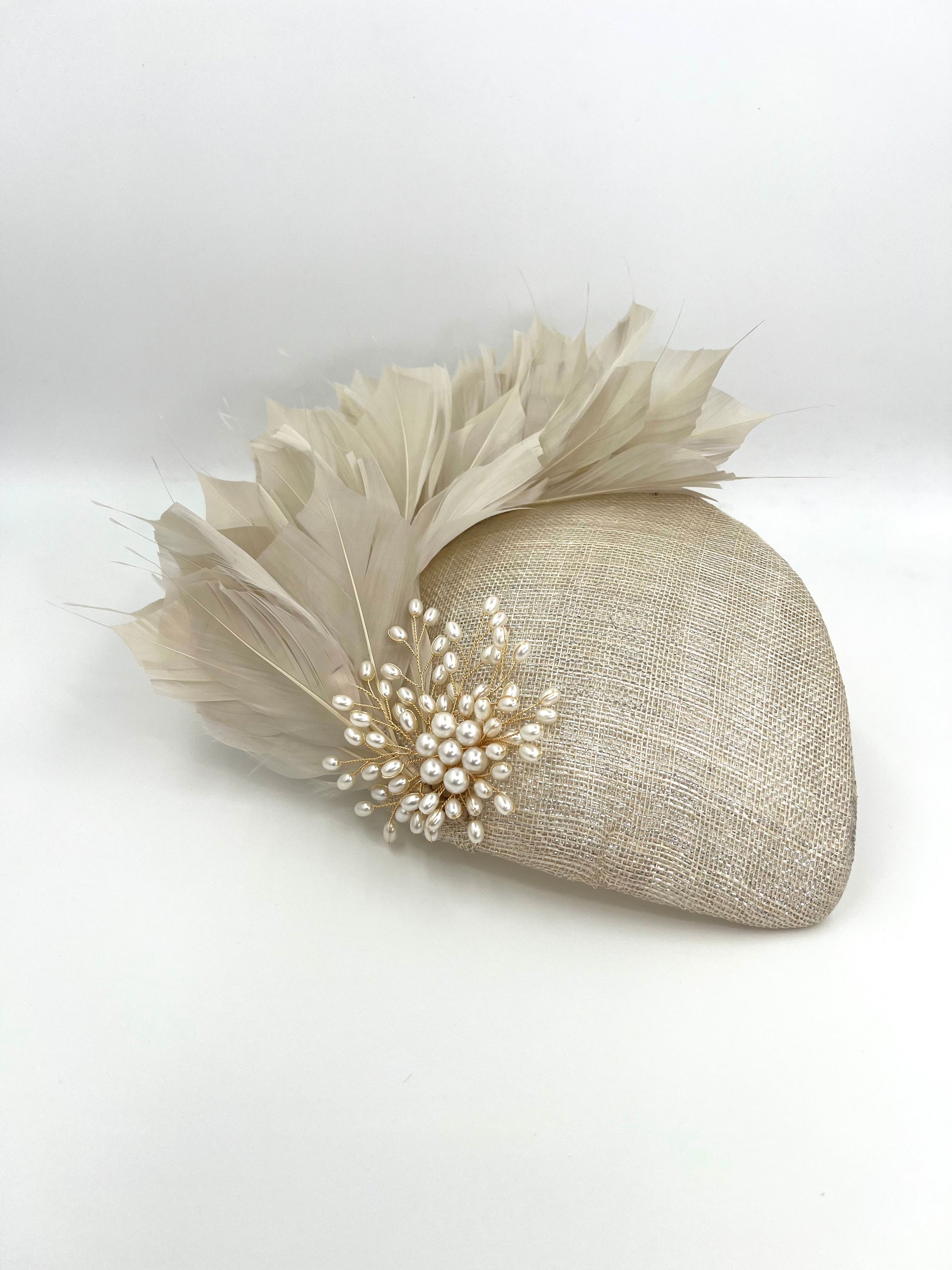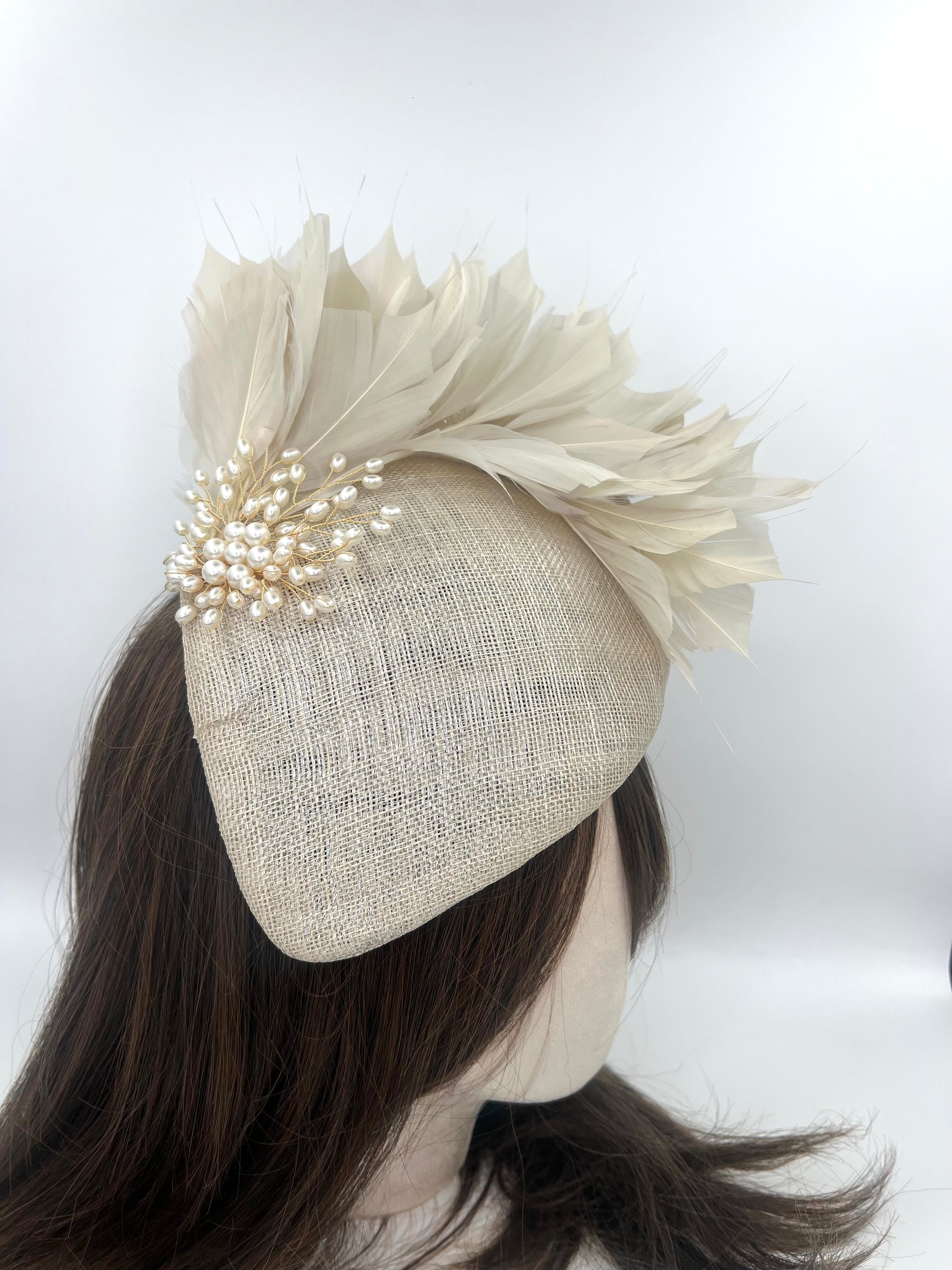 A celebration of soft sophistication and timeless elegance. Handcrafted from iridescent beige sinamay, this beautifully sculpted piece features delicate light-beige feathers and pearl adornments that bring texture and subtle movement.